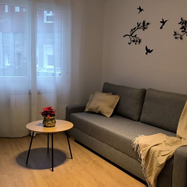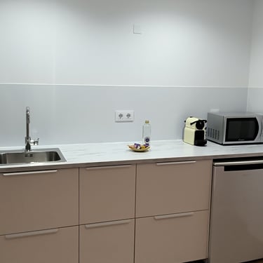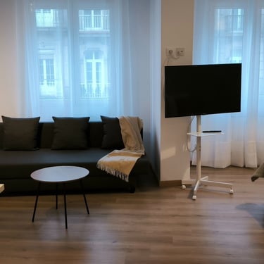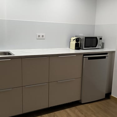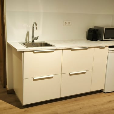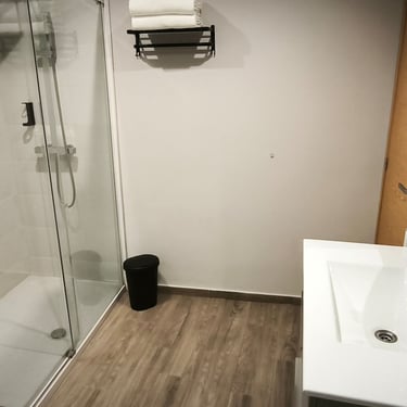 Our double room offers a well-designed and comfortable space, with separate bedroom and lounge for added convenience. It features twin beds, private bathroom with shower, private WiFi, 42" Smart TV, microwave, coffee maker, fridge, and basic kitchenware. The countertop provides support space but is not equipped with stovetops or a full kitchen. The remote-access intercom makes hotel entry and external deliveries easy to manage. A simple and complete option for resting with total autonomy.